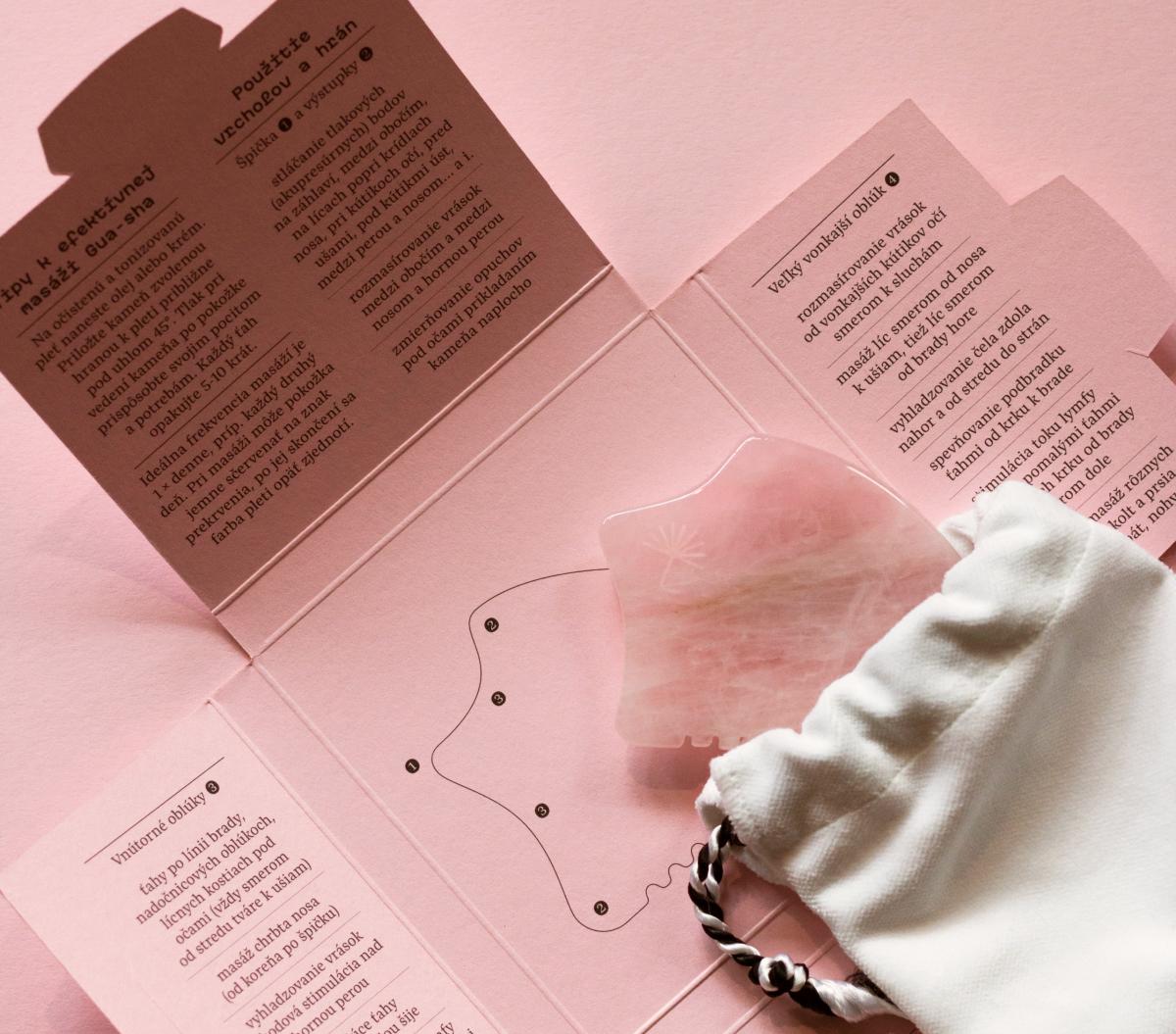 Čo sa skráva v peknej, dizajnovej ružovej krabičke? Je tam zamatové vrecúško, ktoré chráni pred rozbitím malú, ale (pri pravidelnom používaní) veľmi účinnú pomôcku pravidelných rituálov krásy. Je to masážny kameň Gua-sha z ruženínu, ktorý je hladký a príjemný na dotyk. Tieto krásne masážne kamene, najmä ich hrebeňová strana, výborne slúžia (okrem iného) na aj na podporenie prestupnosti aktívnych látok z kozmetických prípravkov do pokožky.