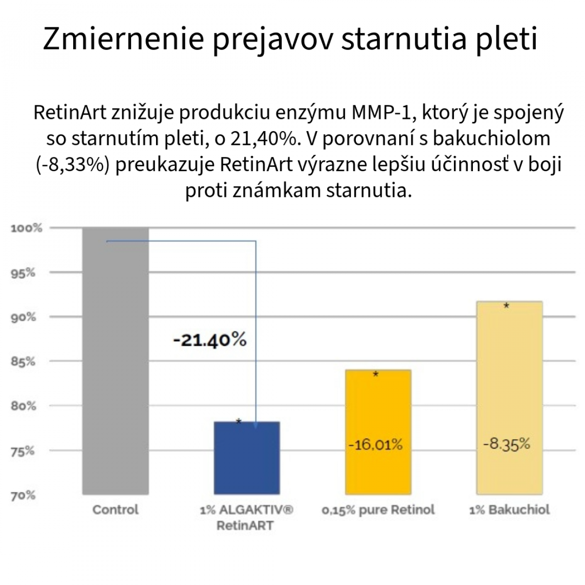 RetinArt ovplyvňuje produkciu enzýmu MMP-1, ktorý je spojený so starnutím pleti. Zníženie produkcie MMP-1 o 21,40% je výrazne vyššie v porovnaní s bakuchiolom, ktorý vykazuje pokles len o 8,35%. To znamená, že RetinArt účinne bojuje proti známkam starnutia a podporuje zdravie pleti.