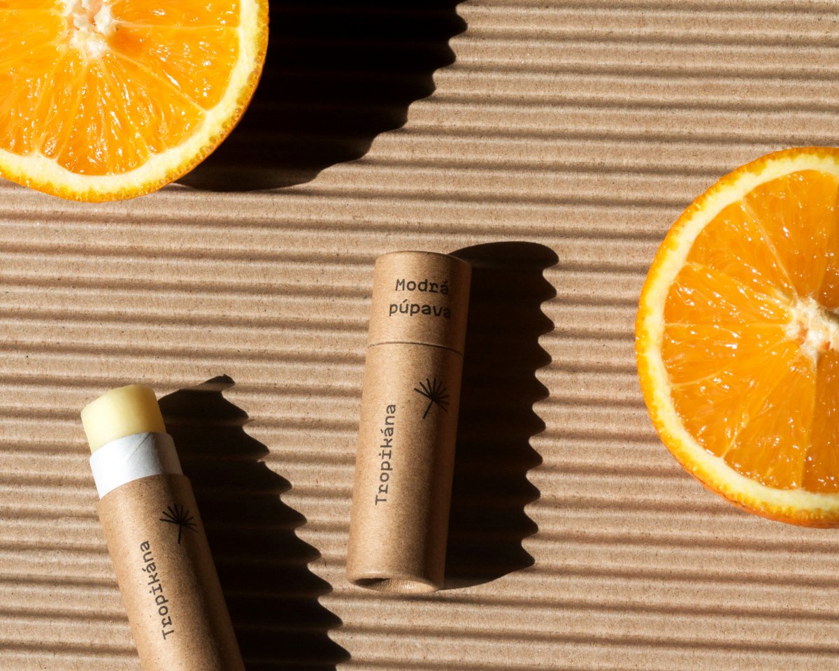 Regeneračný balzam na pery so sviežou pomarančovo-kokosovou vôňou/chuťou v ekologickom papierovom balení.